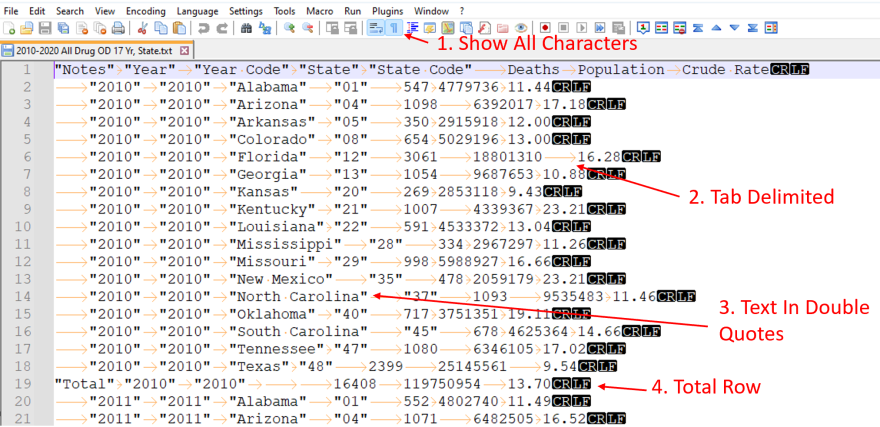 Image 1: Screenshot displaying the CDC WONDER Mortality data text file in Notepad++ with the "Show All Characters" option enabled, revealing the tab-delimited file structure, text values enclosed in double quotes, and total rows embedded within the data.