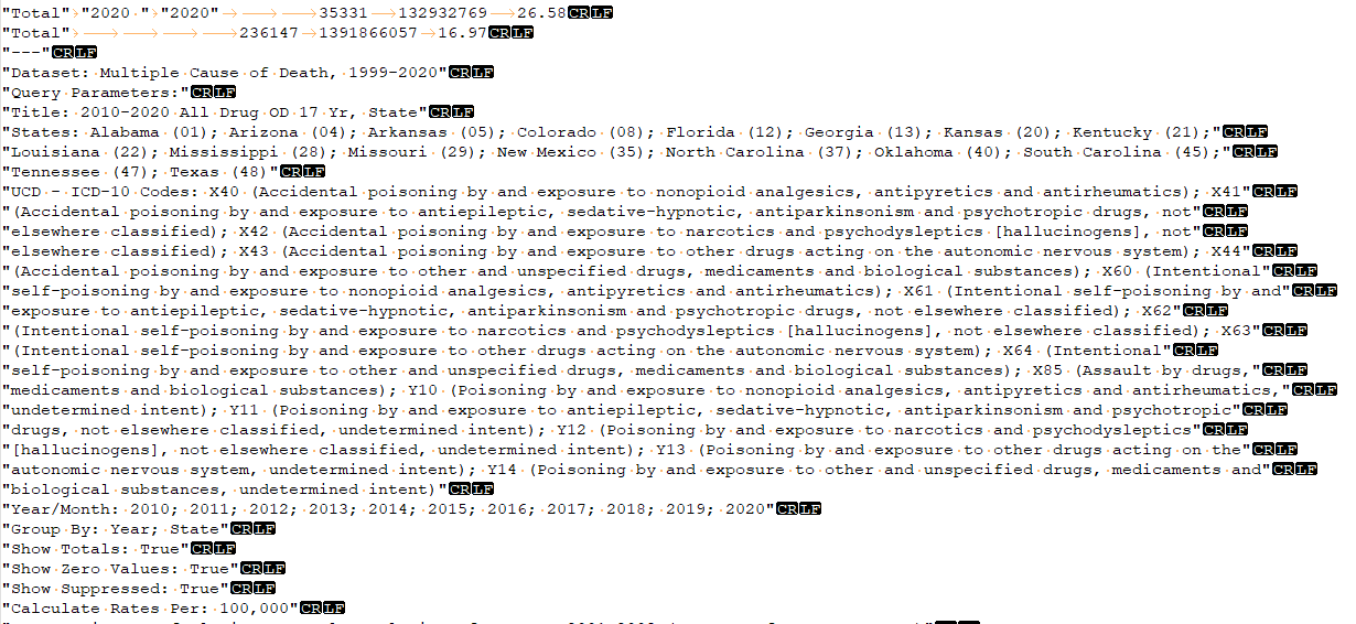 Each text file from CDC WONDER includes a summary of query variables, notes on data suppression, and additional documentation appended at the end of the file. While this supplementary information is useful for understanding the data context, it must be removed before importing the data into a relational database. Instructions on removing it are included below in section 4.2.1.