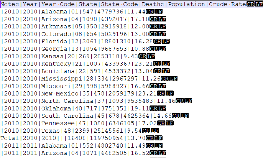Image 3: Screenshot displaying the processed CDC WONDER Mortality data text file in Notepad++, with tab characters replaced by pipe characters, double quotes removed, and unnecessary notes excluded after running the PowerShell script.
