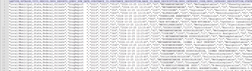 The NFLIS-Drug data was exported as a single CSV file for the queried period using the "CSV Raw Data Export" option. This file format required minimal changes before importing the data into a relational database.
